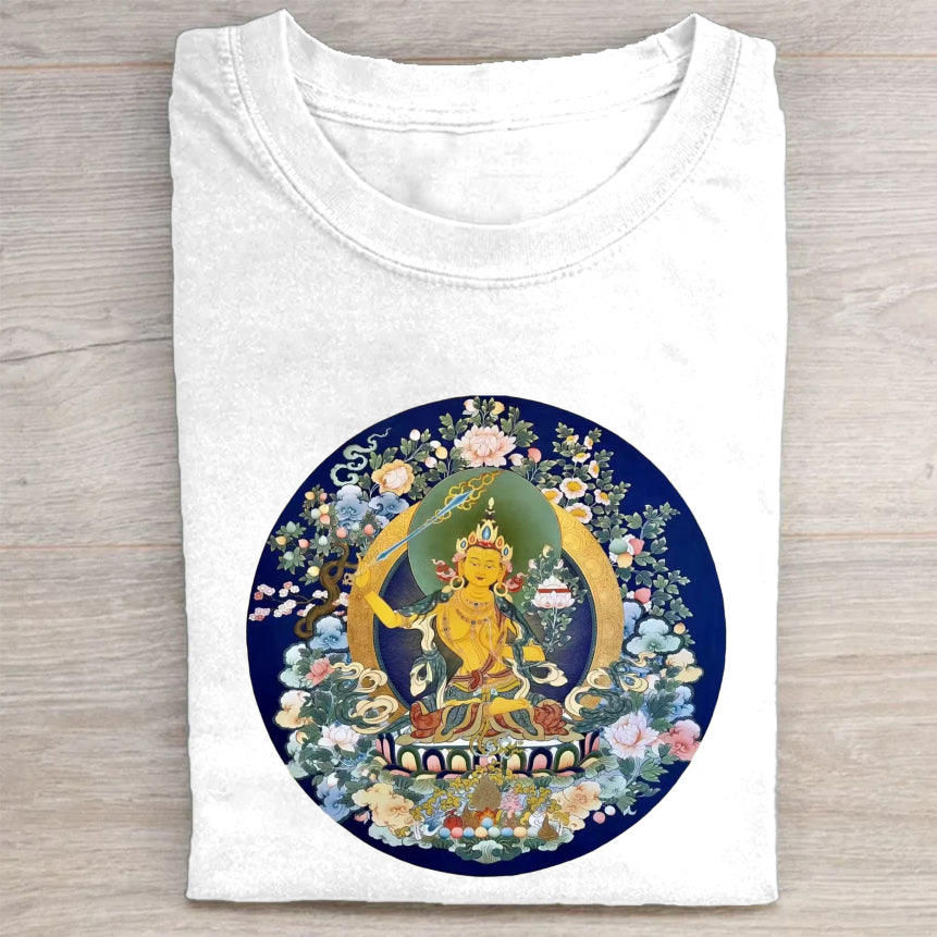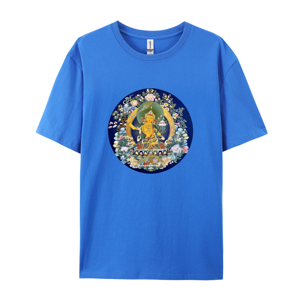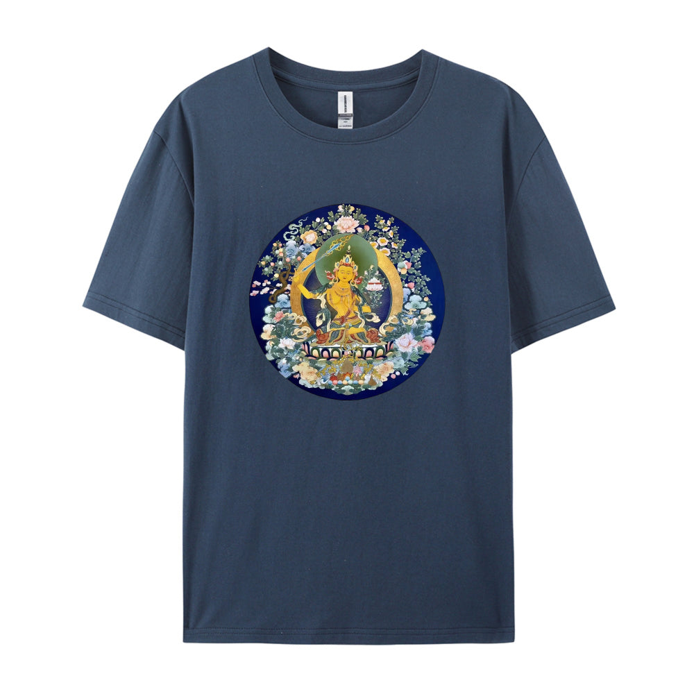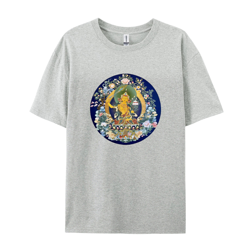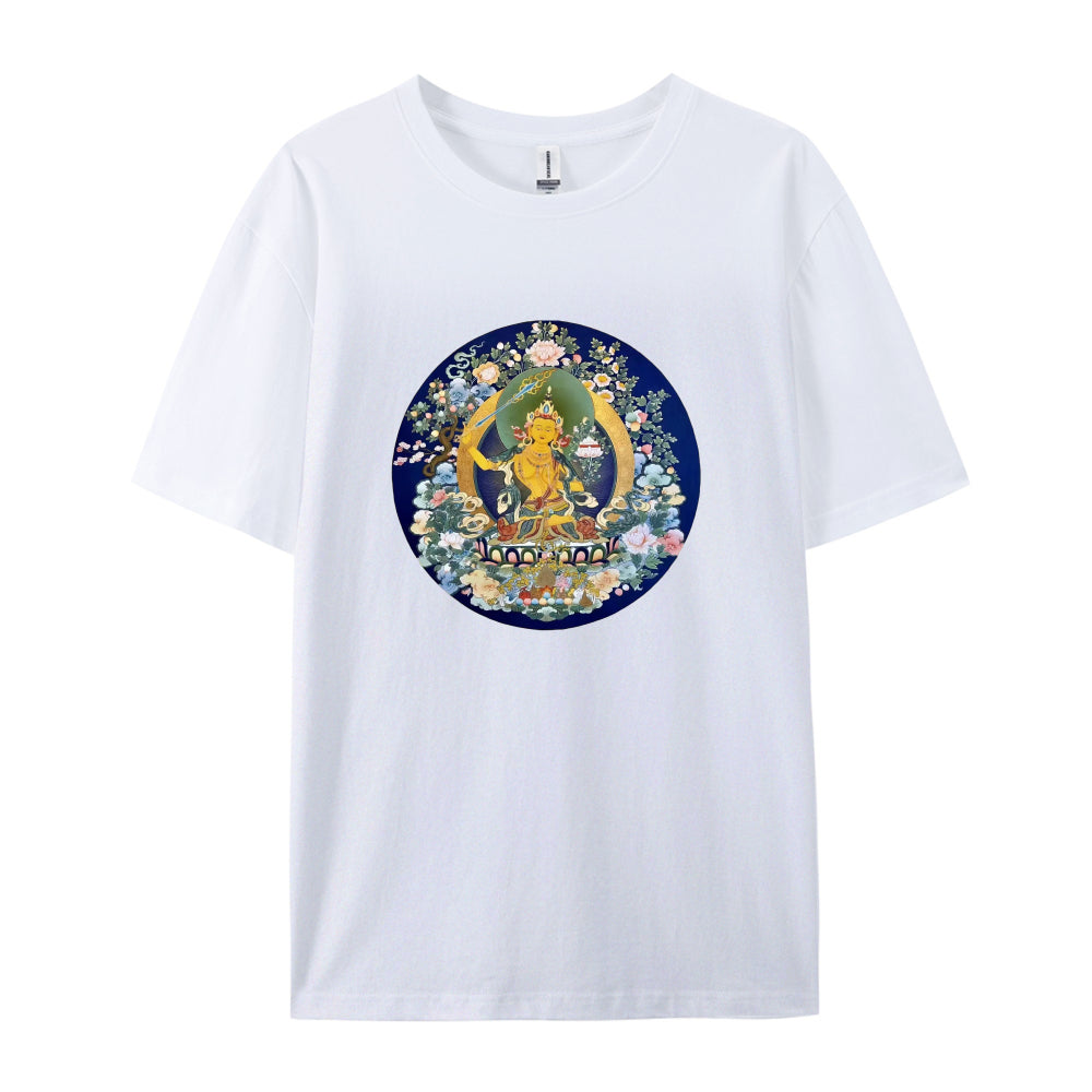 Buddhist Thangka Art T-Shirt Golden Buddha Design Spiritual Meditation Clothing Unique Tibetan Mandala Graphic Tee Unisex Casual Wear Comfortable Cotton Material Ideal for Yoga and Mindfulness Practitioners