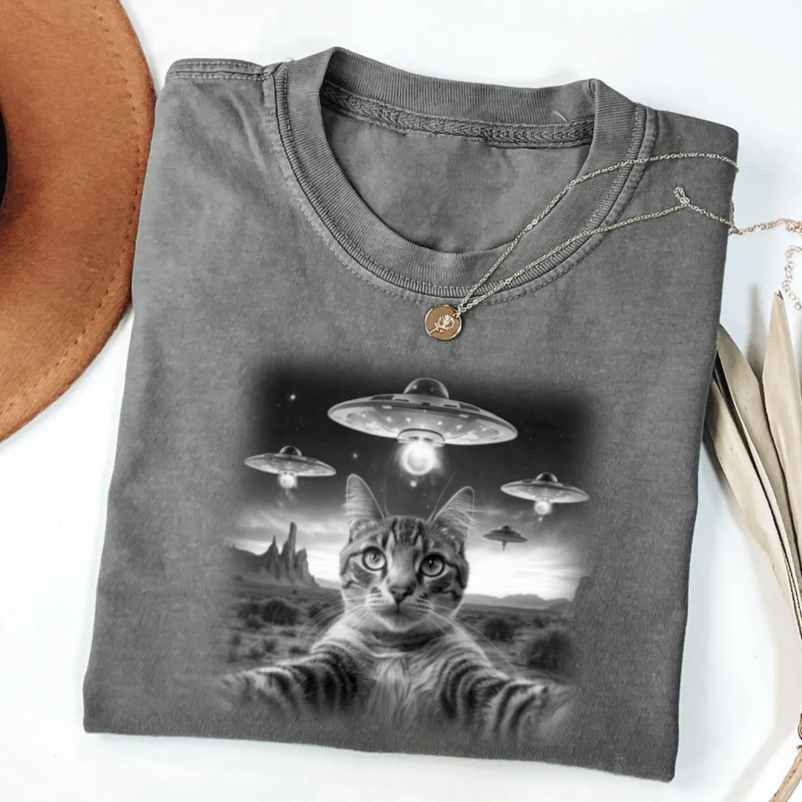 Cat Selfie With UFO Art Acid Wash Sweatshirt