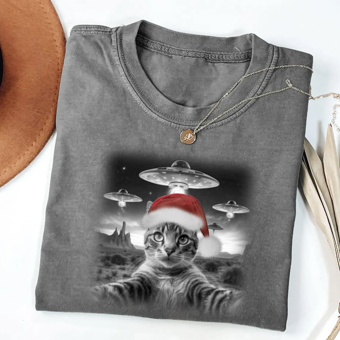 Christmas Cat Selfle With UFO Art Acid Wash Sweatshirt