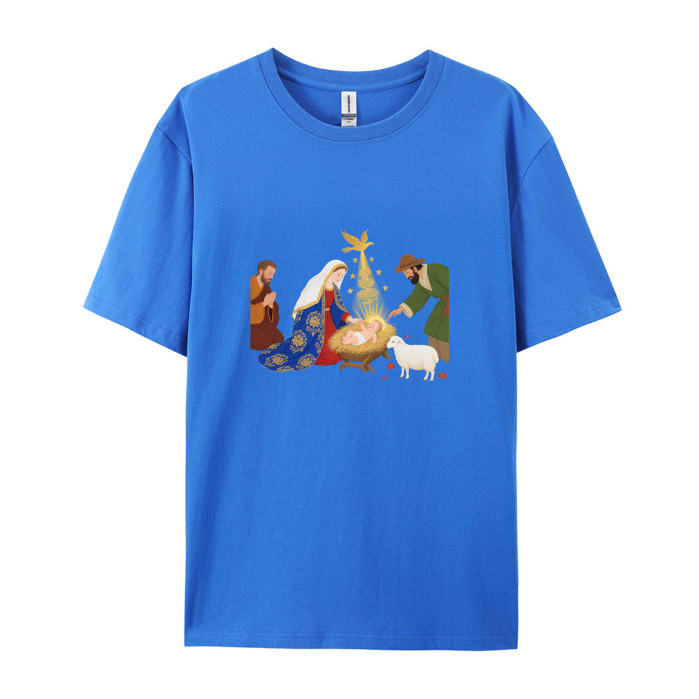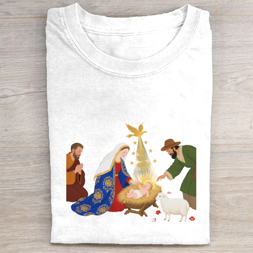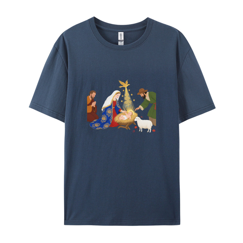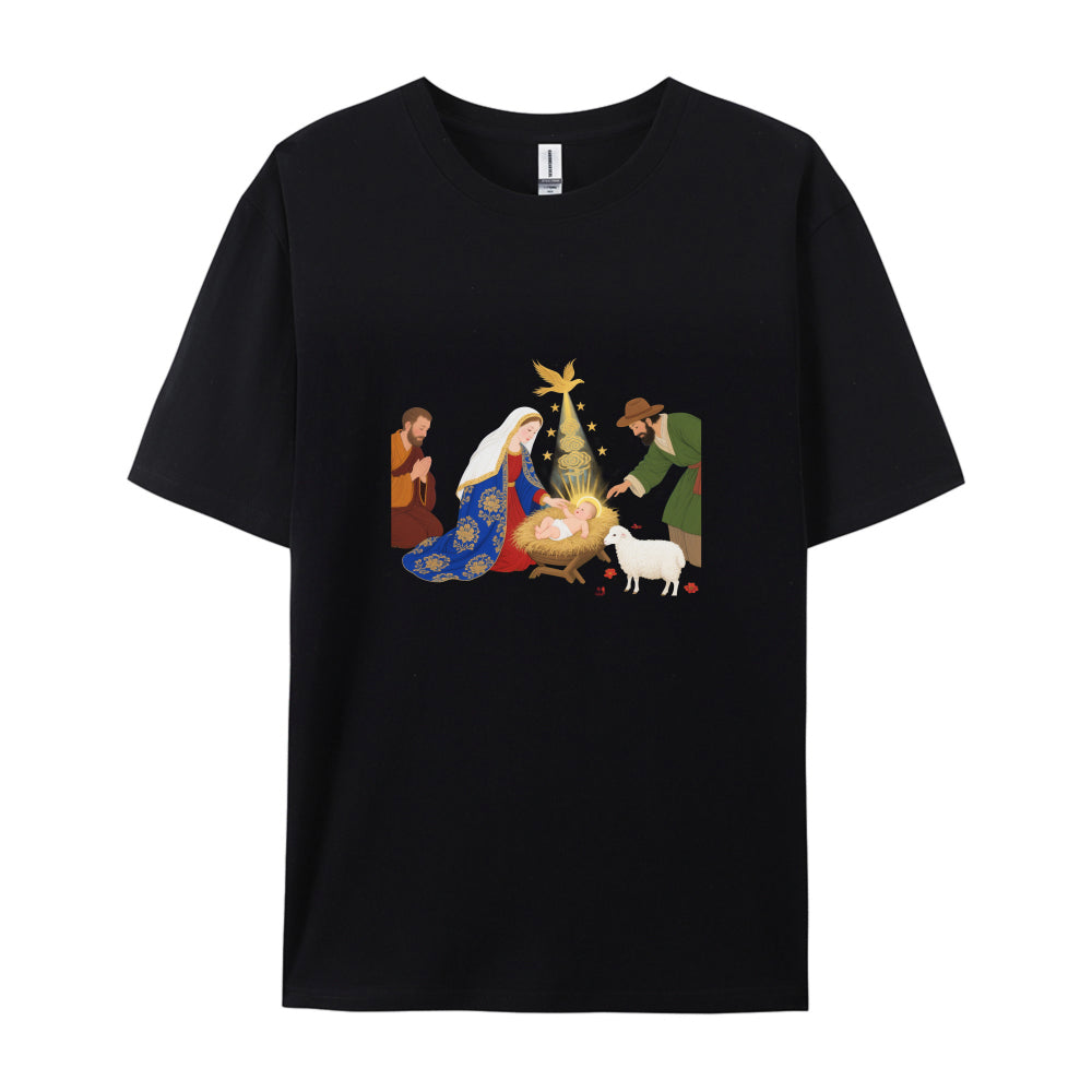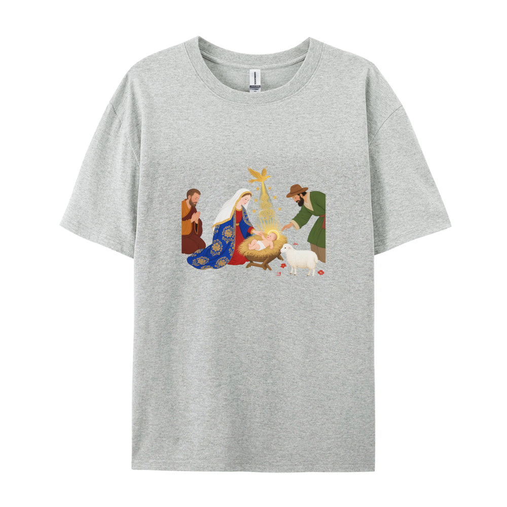 Christmas Nativity Scene T-Shirt Festive Holiday Jesus Birth Design Men Women Unisex Graphic Tee Xmas Gift Idea for Family Friends Comfortable Soft Cotton Blend Material White Crewneck Top with Vibrant Print