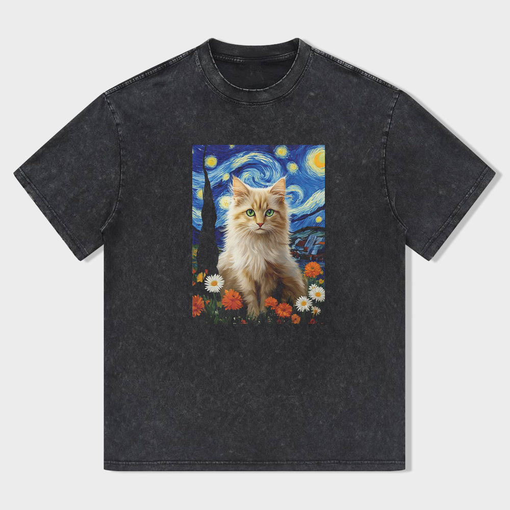 Classic Crew Neck Black T-Shirt with Van Gogh Cat Art Print for Casual Wear