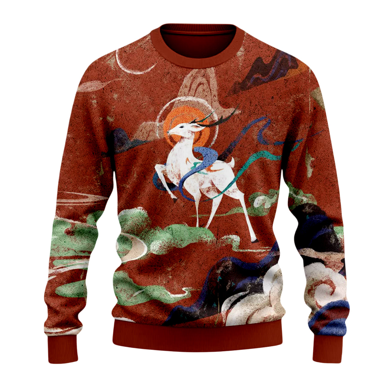 Dunhuang Art Mythical Deer and Clouds Print Sweater