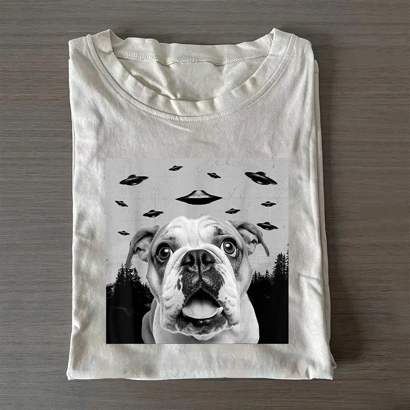English Bulldog Taking Selfie with UFOs Funny T-Shirt