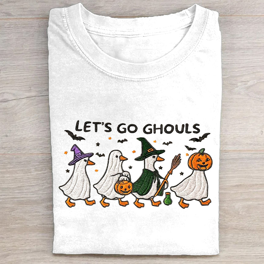 Let's Go Ghouls Halloween Ghosts and Pumpkin Graphic Print T-Shirt