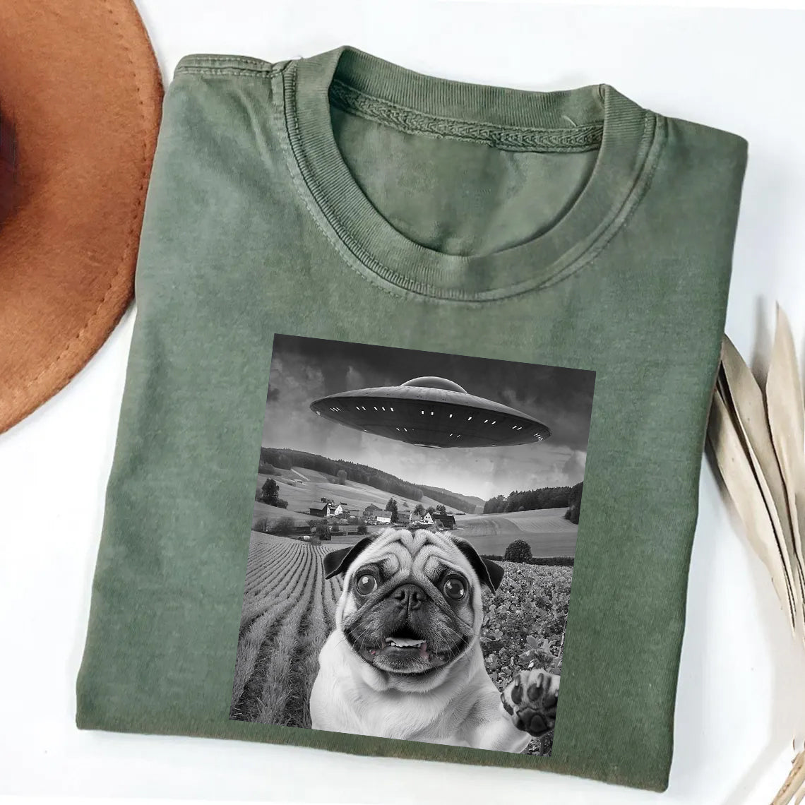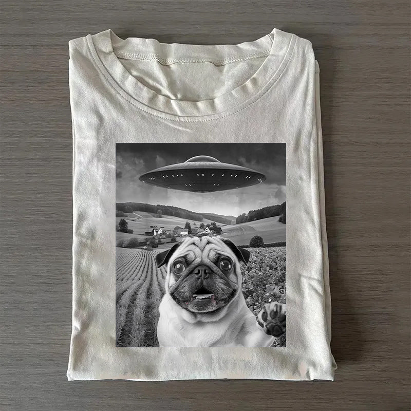 Pug Taking Selfie with UFOs Funny Unisex T-Shirt