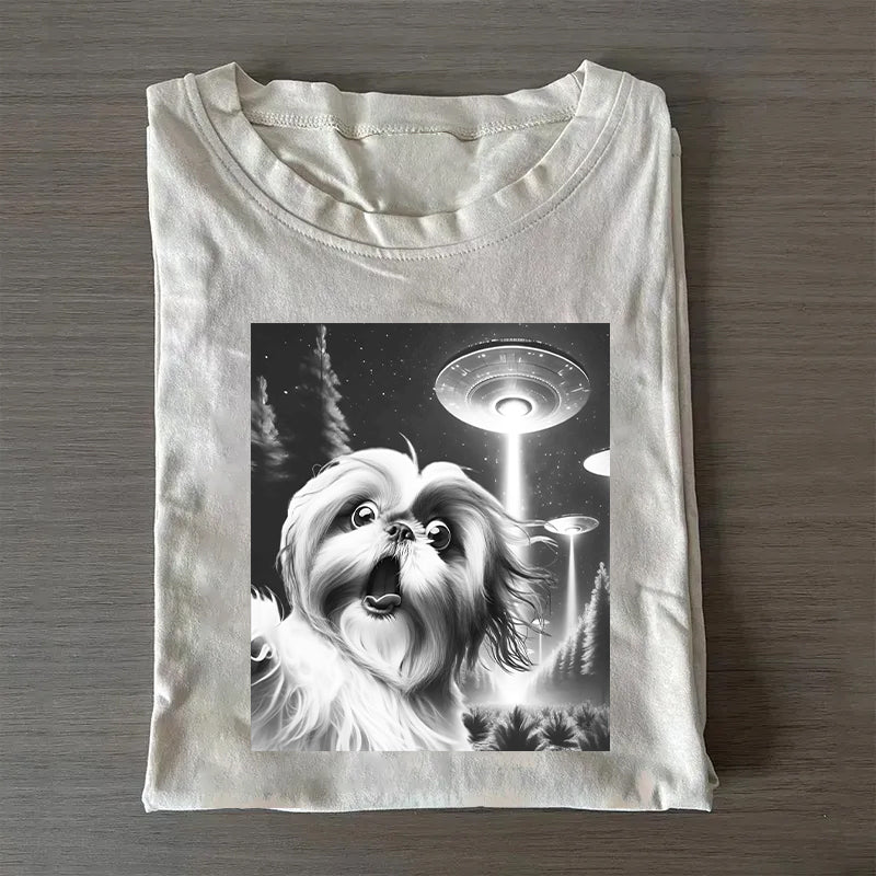 Shih Tzu Taking Selfie with UFOs Funny T-Shirt