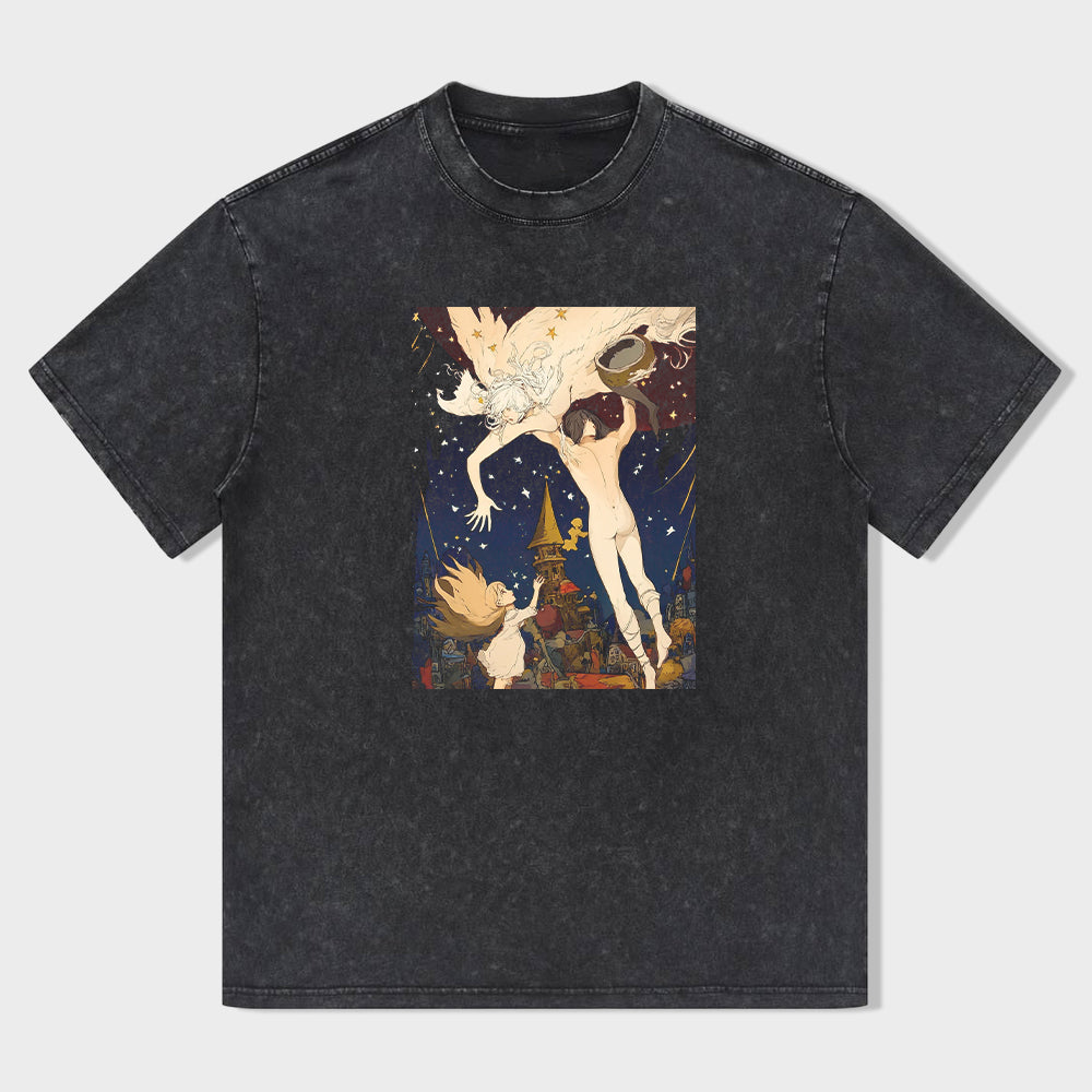 Vintage Black T-Shirt with Celestial Angel Graphic Print